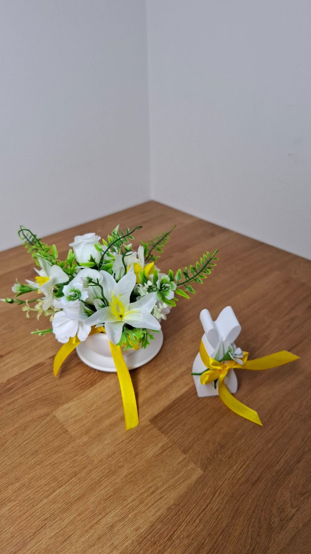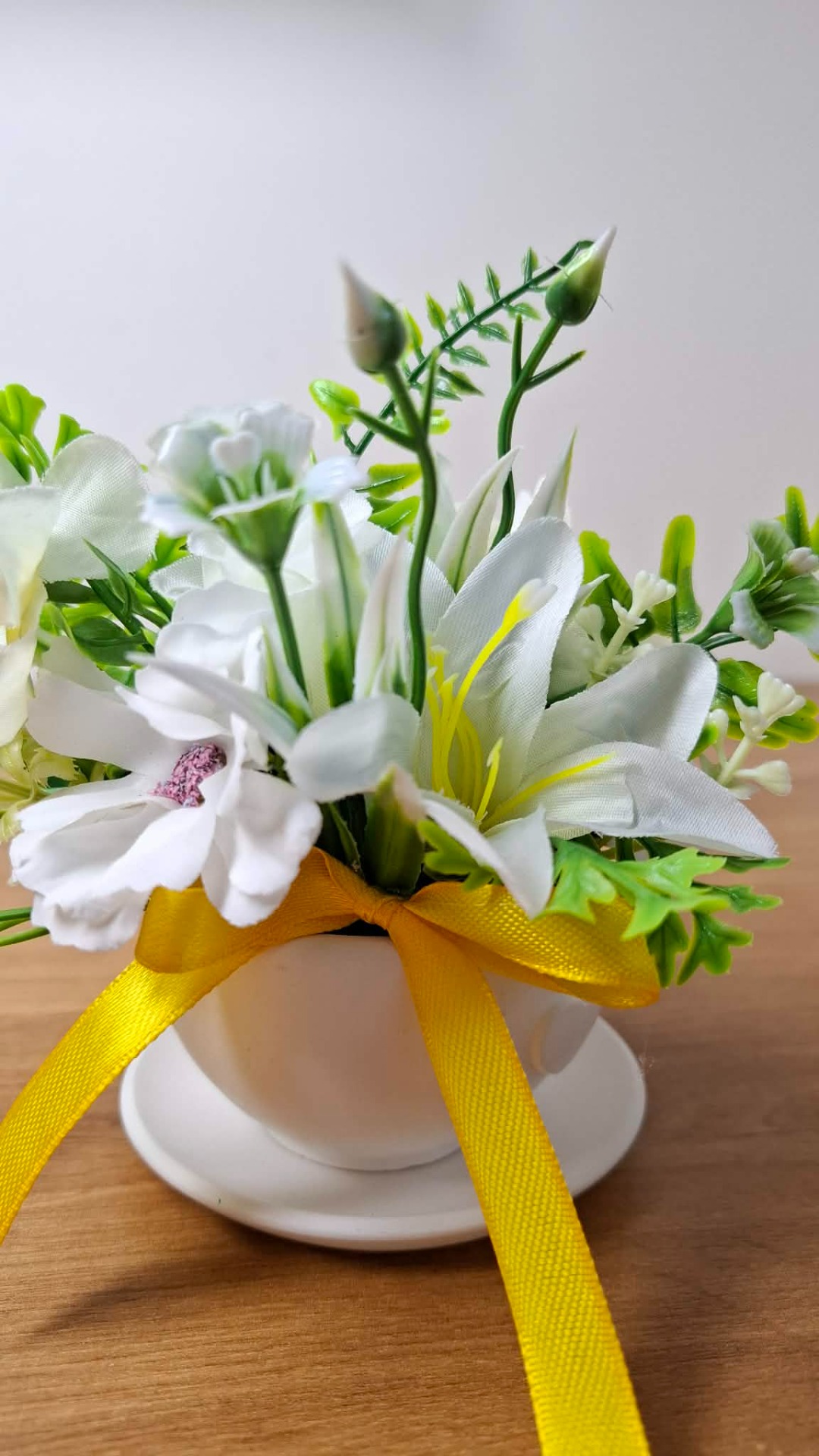 Hrníček je doplněn květinovou vazbou v svěžích jarních tónech a žlutou stuhou, která celé aranžmá krásně prosvětluje a dodává mu radostný nádech jara. Zajíček ladí s celkem a vytváří harmonickou dvojici, která vnese do interiéru lehkost a jemnou sváteční atmosféru.