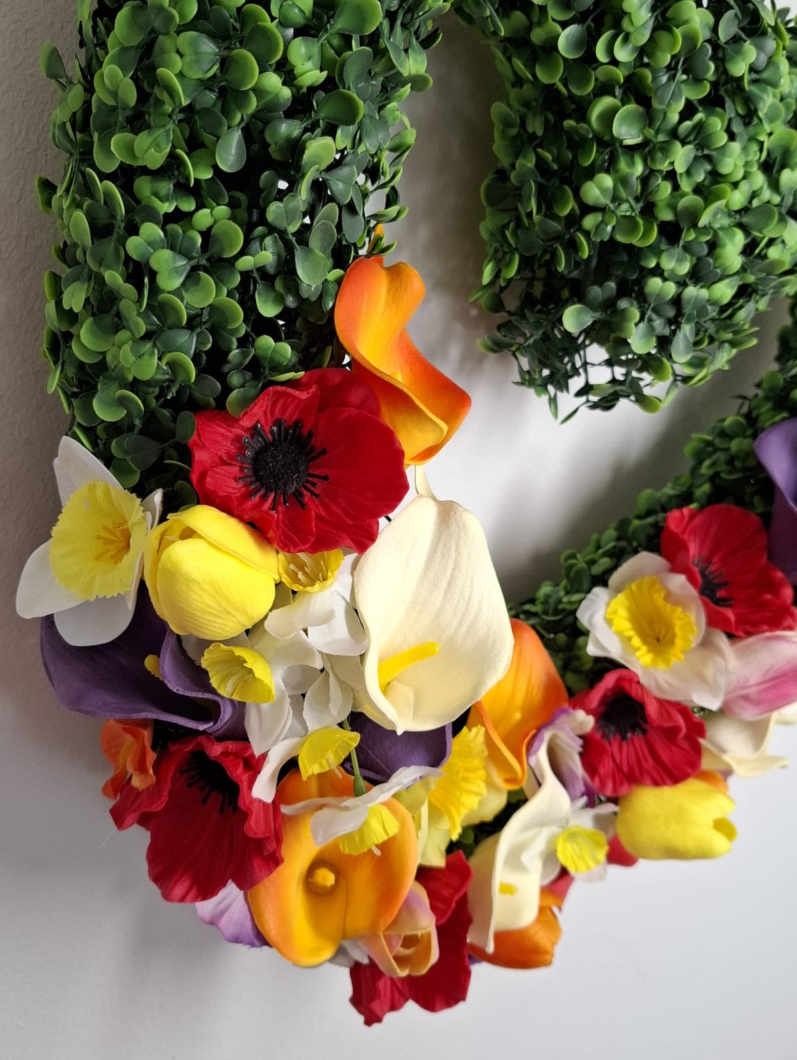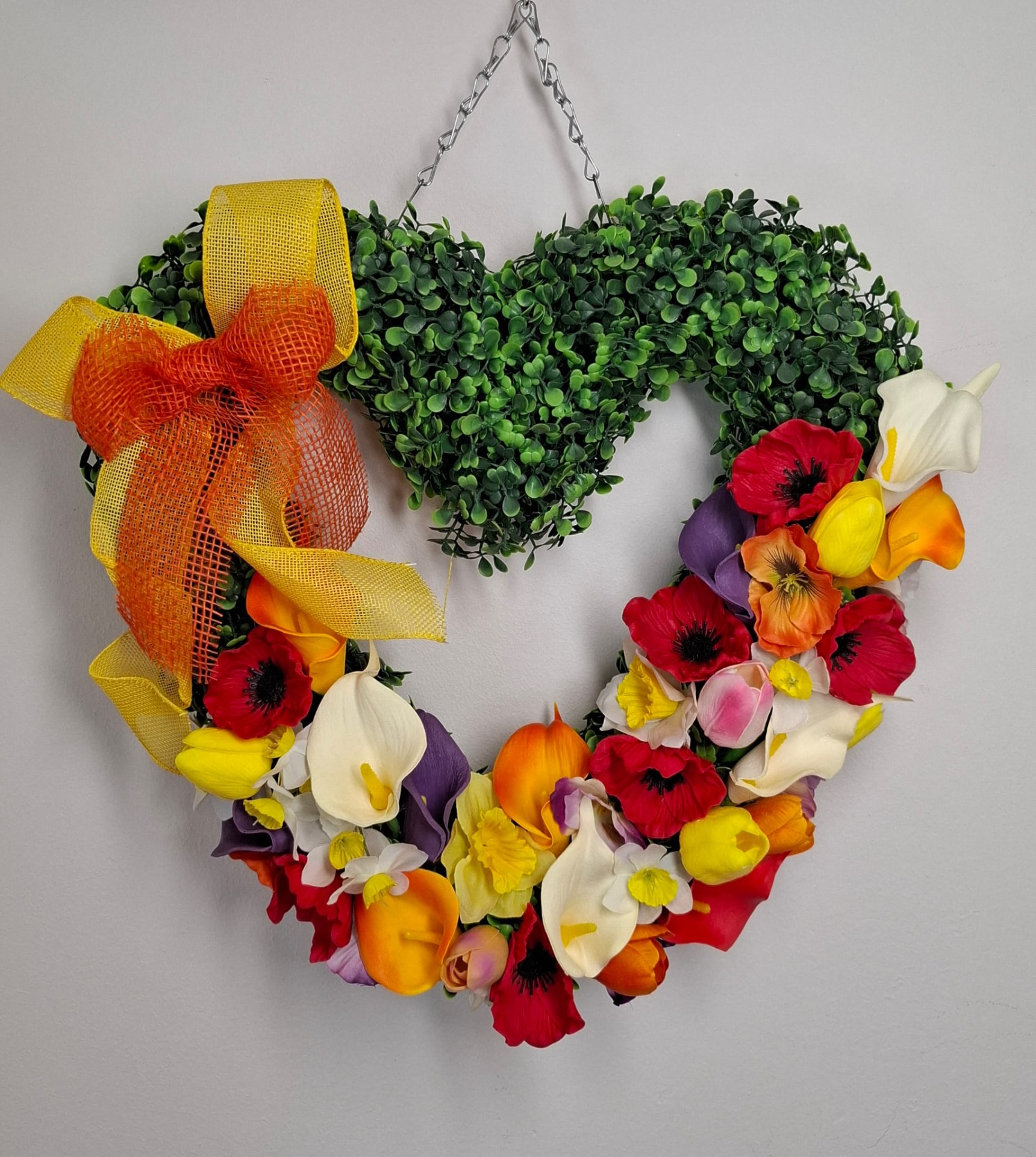 Dekorační srdce z husté zeleně doplněné výraznými jarními květy v červené, žluté, oranžové, bílé a fialové barvě. Dominantní květinová kompozice ve spodní části vytváří elegantní a zároveň energický vzhled. Lze i s mašlí.