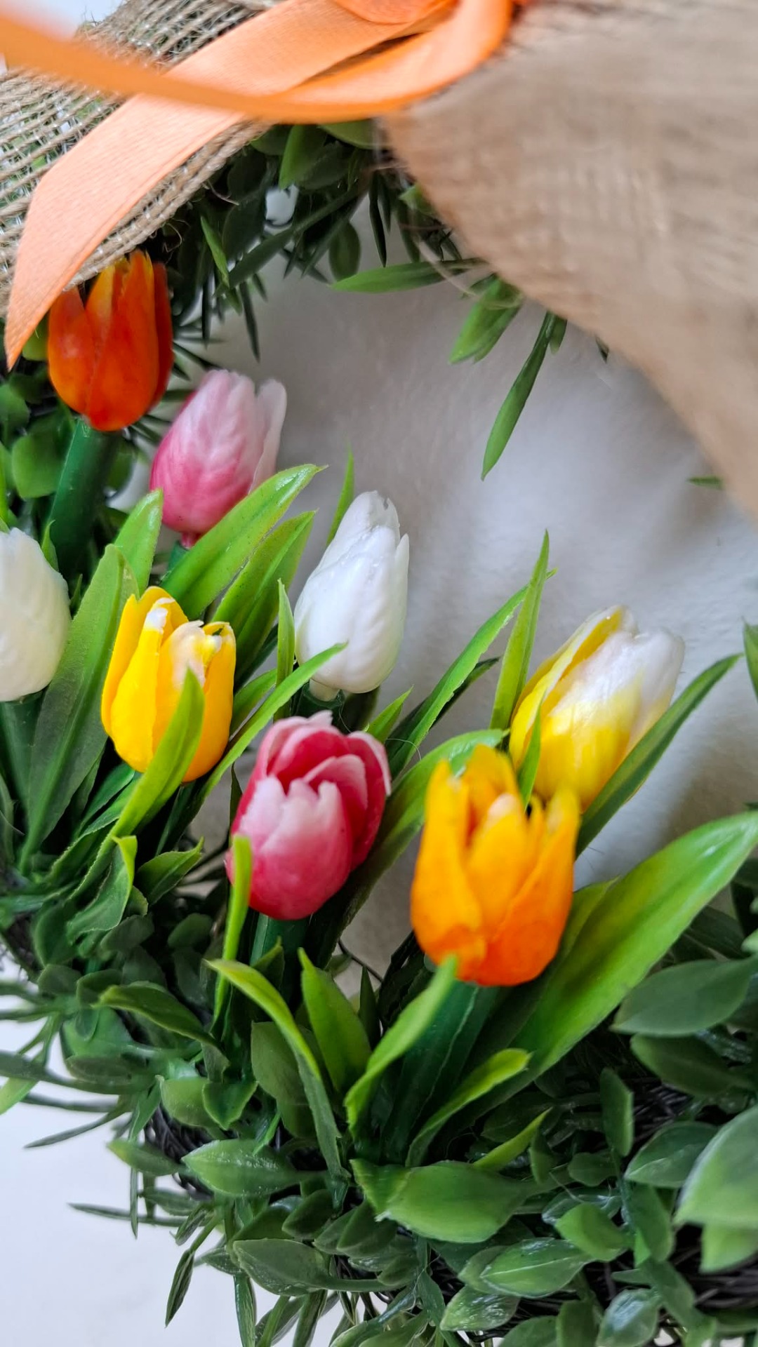 Veselý jarní věnec ve tvaru zajíčka, který okamžitě rozzáří dveře i interiér. Trvanlivý základ je doplněn svěží zelení a bohatou kyticí tulipánů v bílé, žluté, růžové a oranžové barvě.