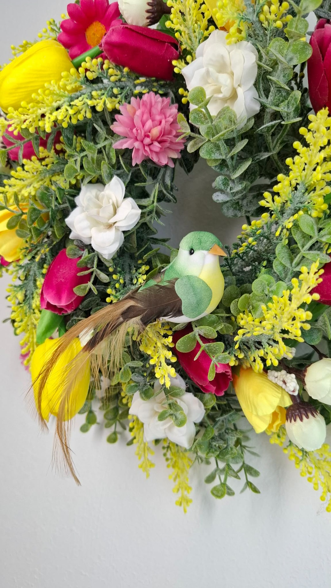 Dominantním prvkem je dekorativní ptáček s peříčkem, který celé aranžmá oživuje a dodává mu nádech probouzející se přírody. Věnec je ideální na vstupní dveře, ale stejně krásně vynikne i na stěně či v interiéru.