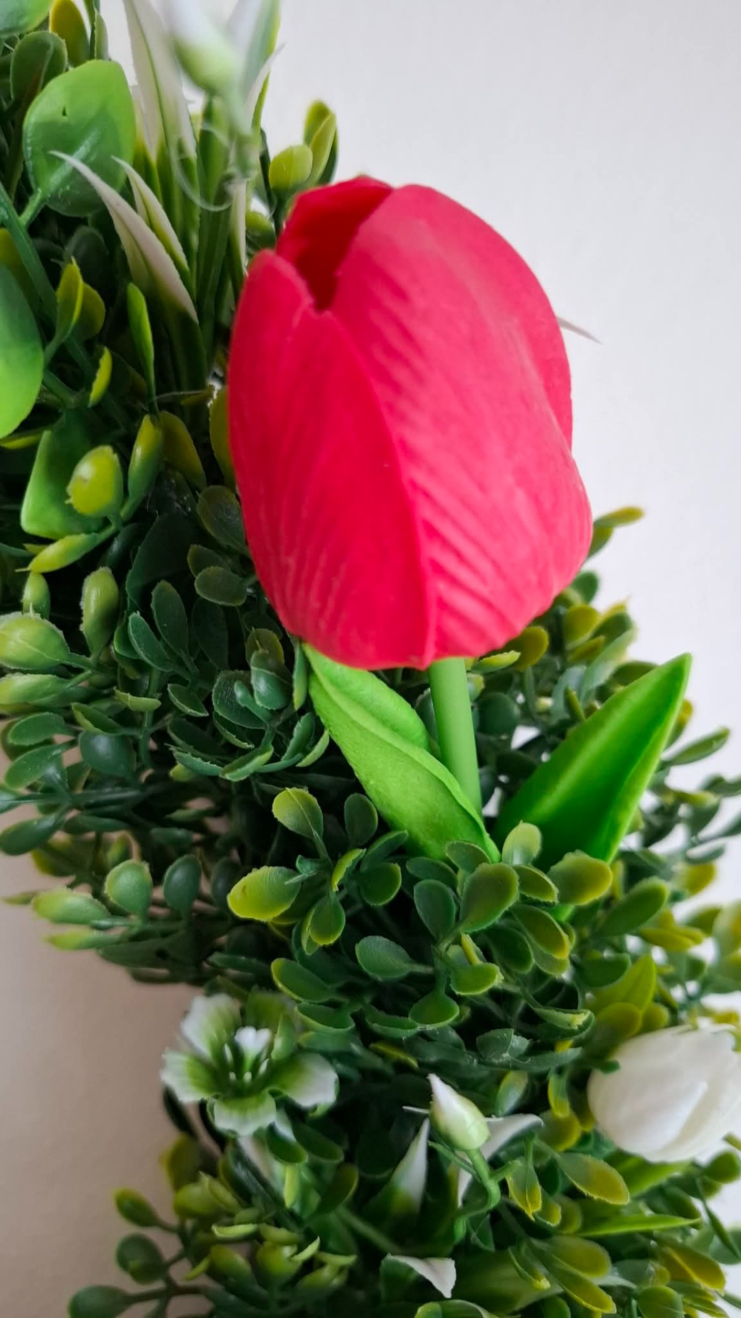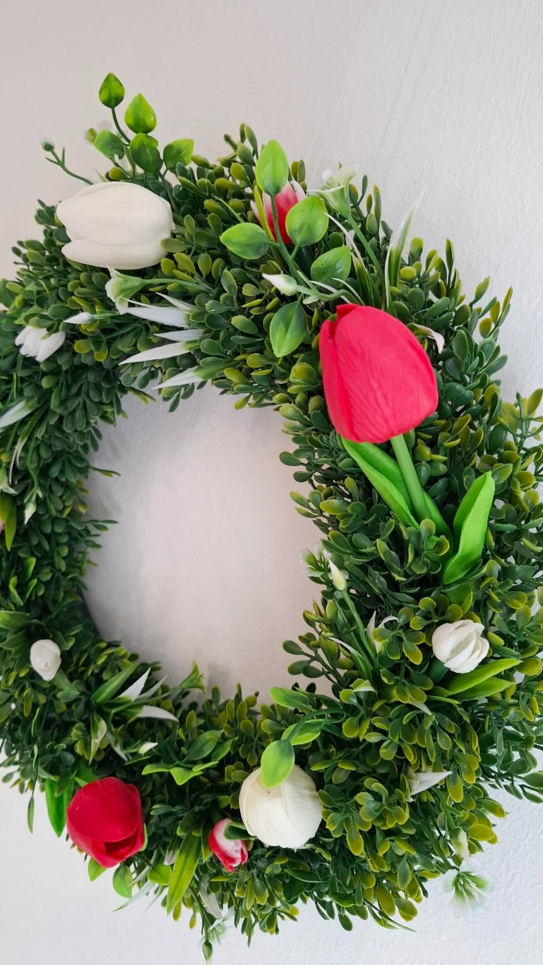 Svěží a elegantní dekorace, která rozzáří každý prostor. Hustý zelený základ působí přirozeně a bohatě, zatímco červené a bílé tulipány dodávají věnci jemný barevný kontrast a nádech jarní energie.
