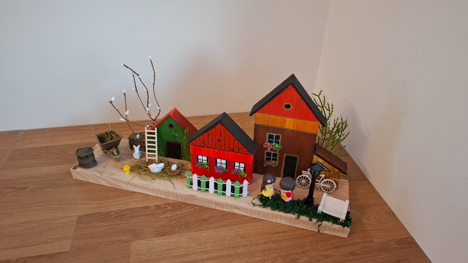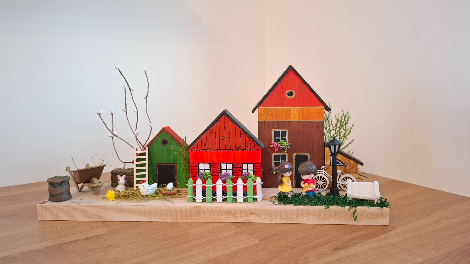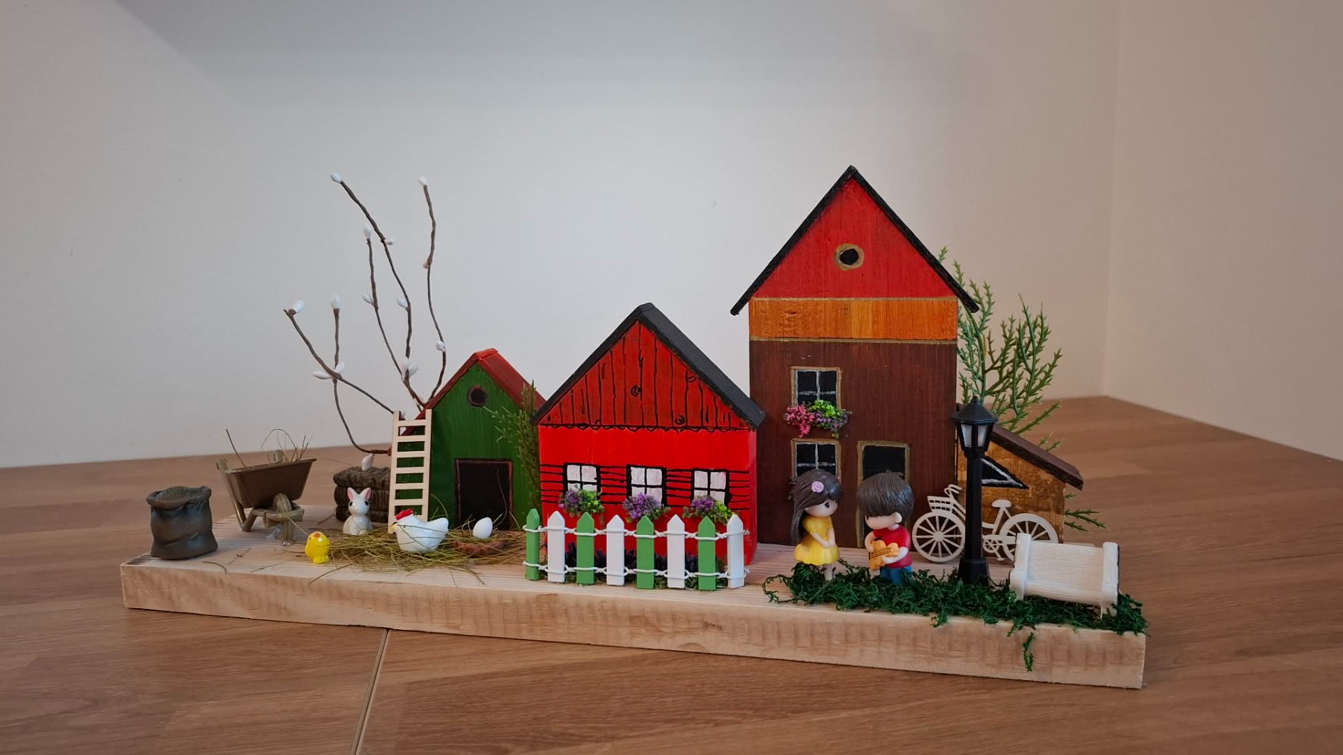 Tahle jedinečná jarní dekorace vnese do vašeho domova klid, pohodu a kouzlo venkova. Každý detail je tvořený s láskou – domečky, zahrádka i drobné postavičky vytváří krásný příběh.