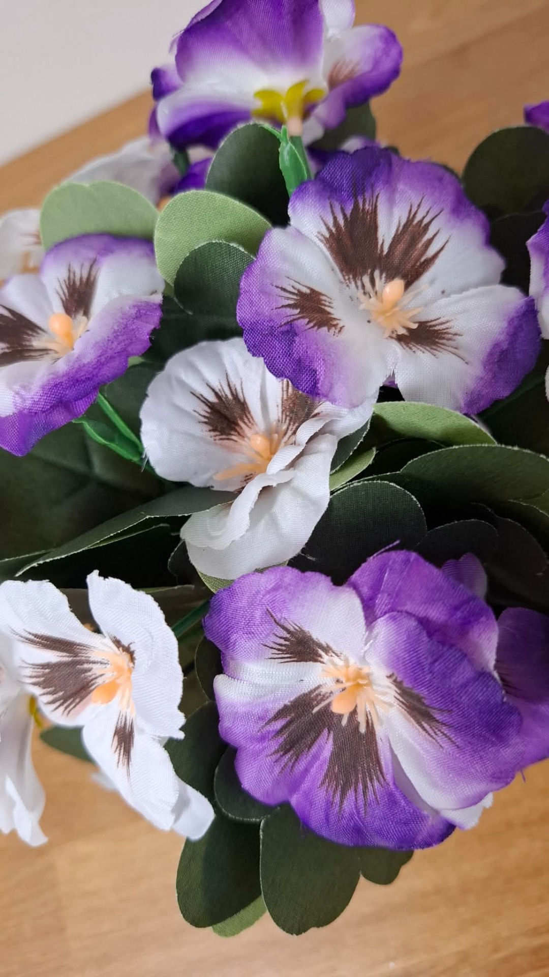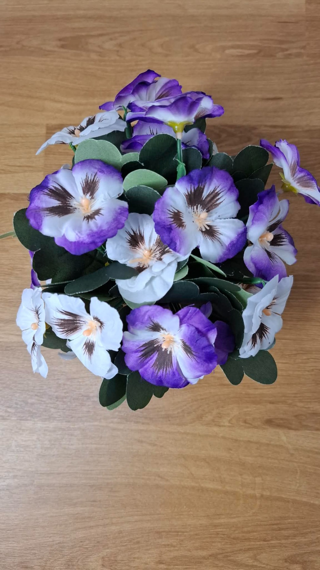 Romantická dekorace s jemnými maceškami v bílo-fialové kombinaci. Květiny jsou zasazeny do kovového fialového obalu doplněného přírodním jutovým provázkem, který podtrhuje rustikální a zároveň elegantní vzhled.