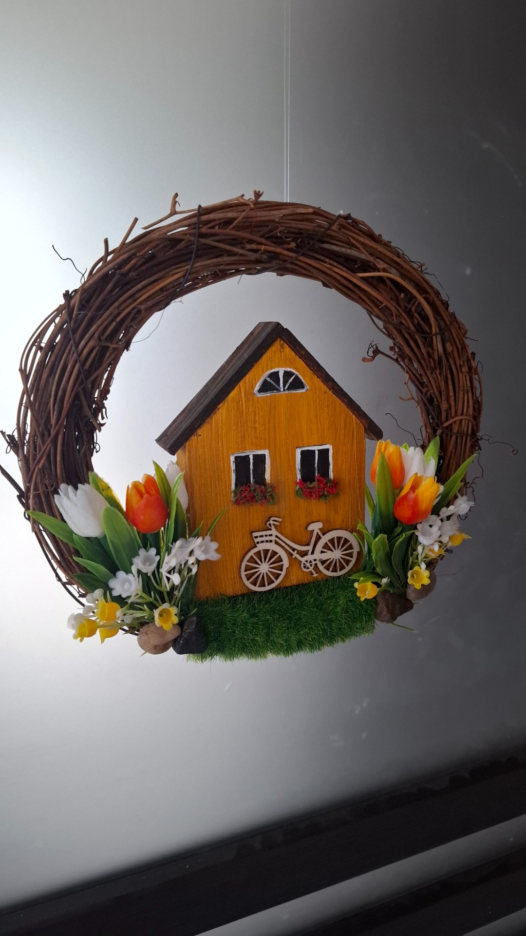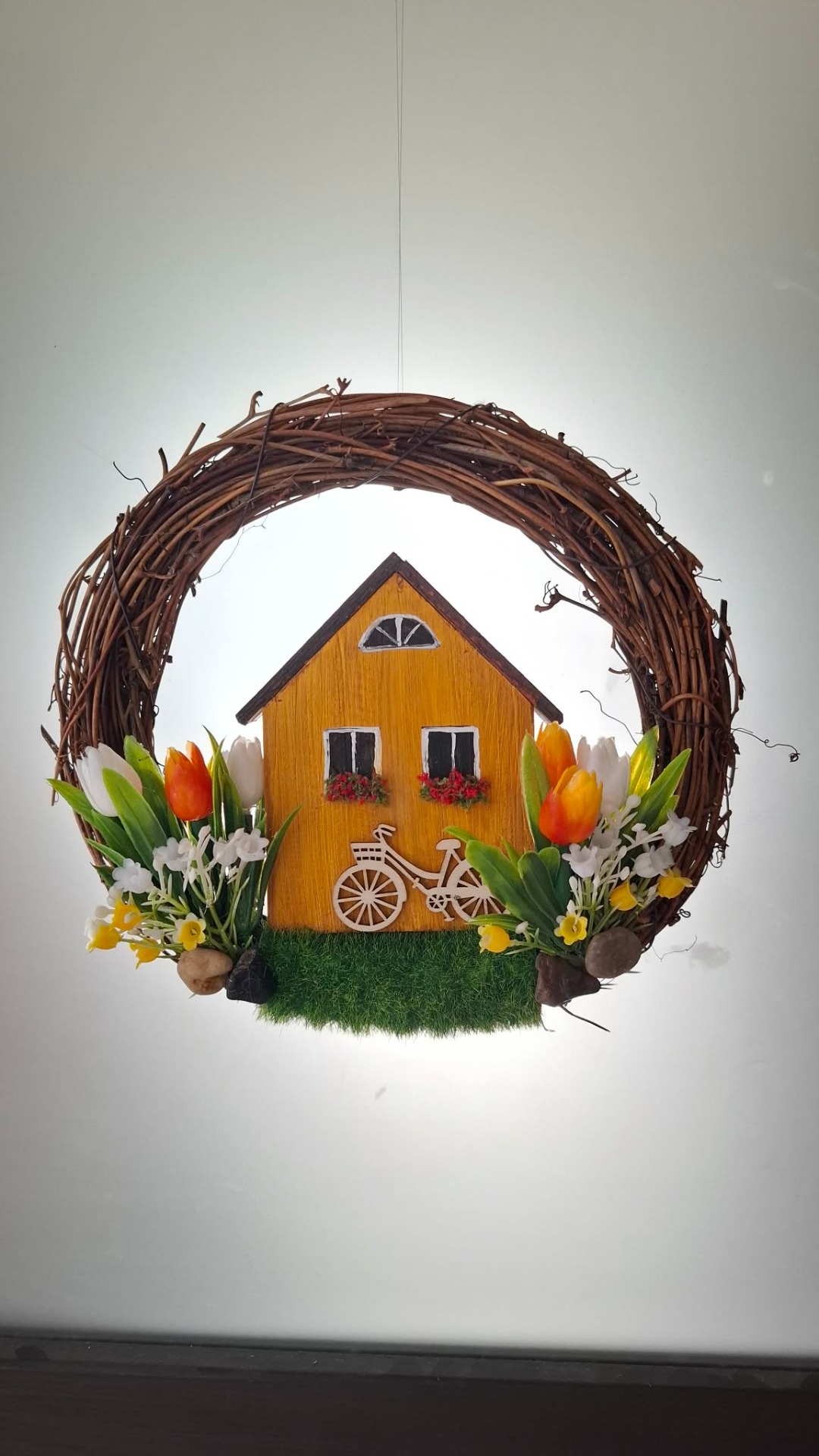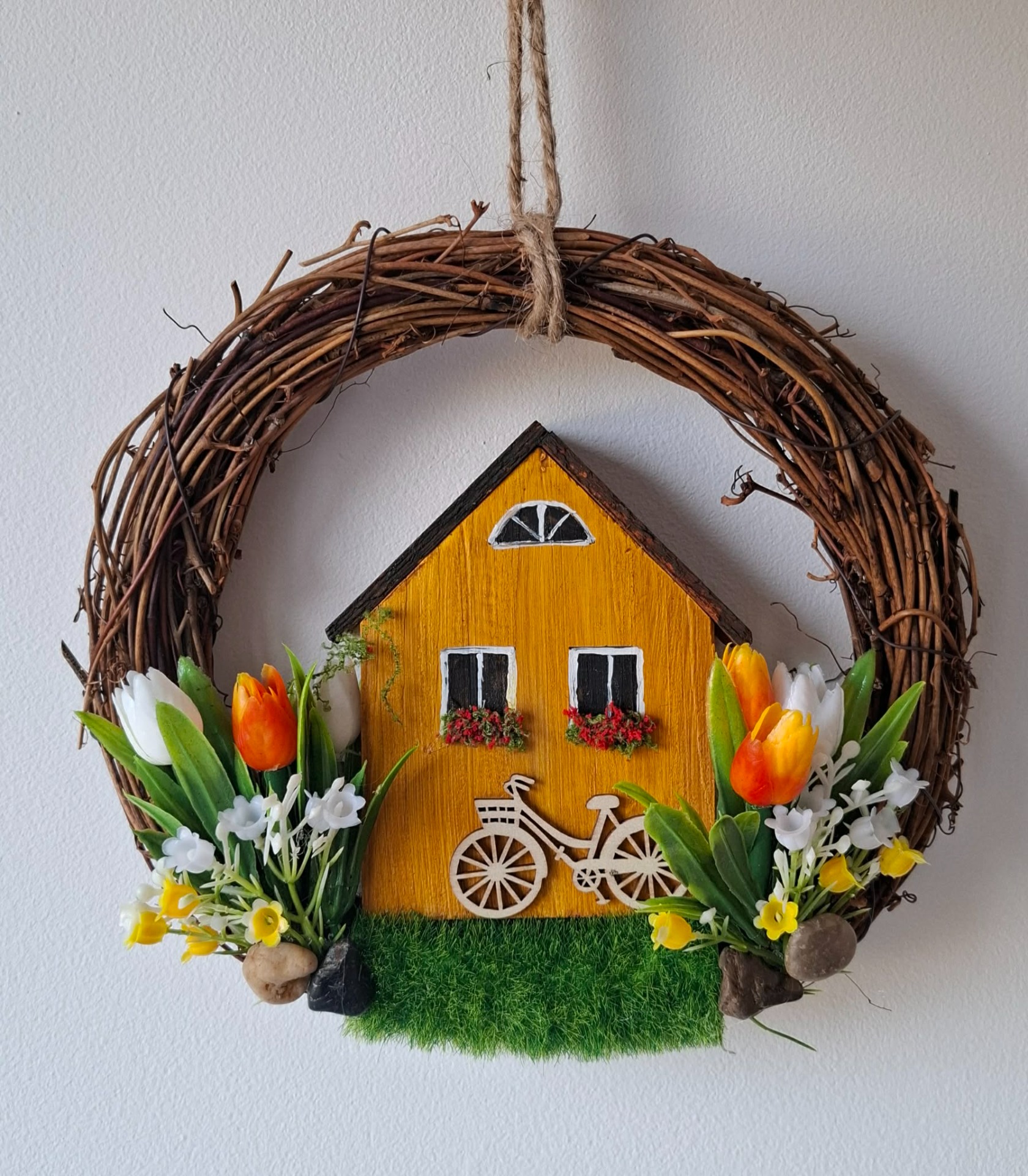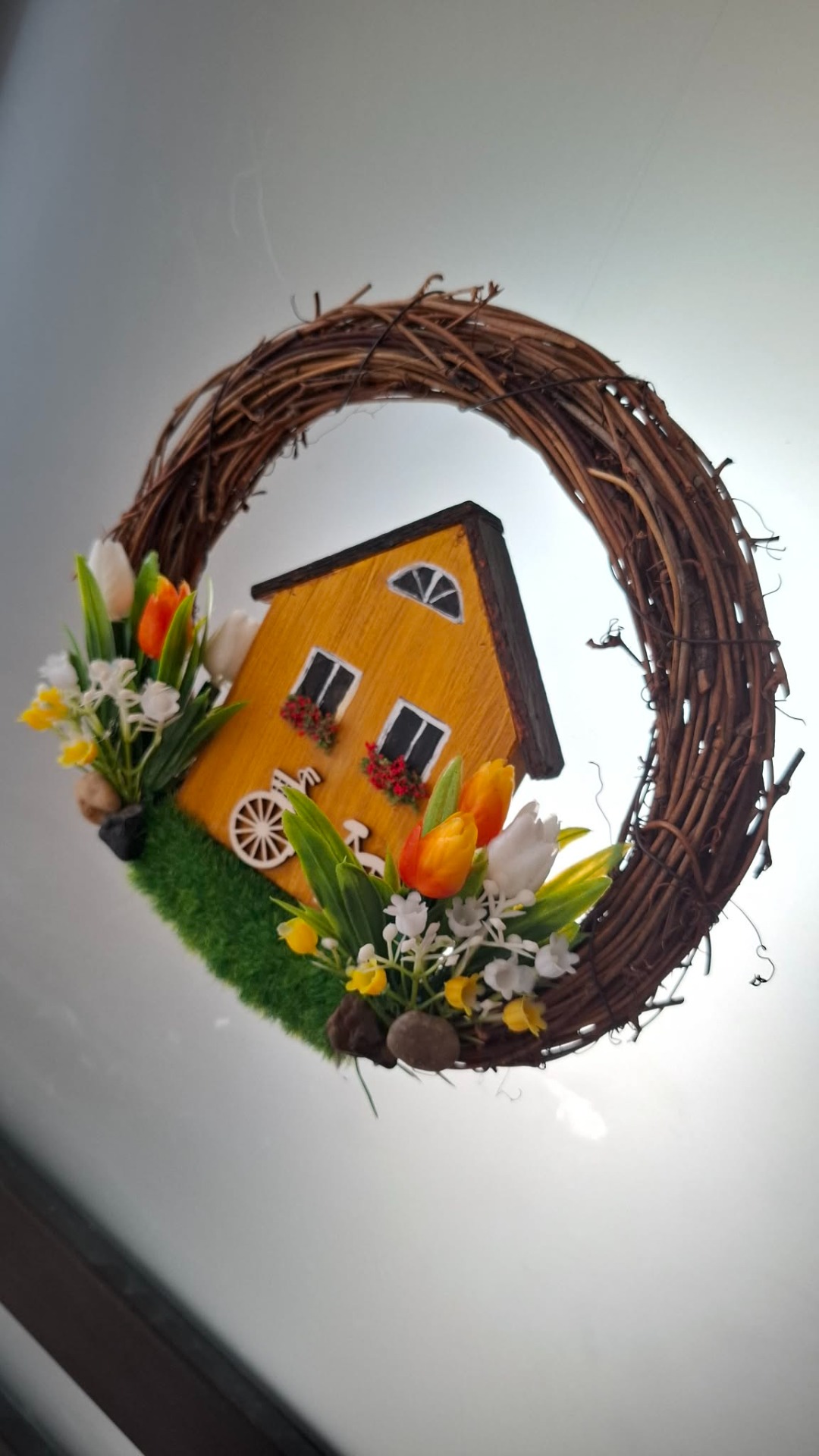 Jarní dekorace na zavěšení s malovaným domečkem, tulipány a drobnými kvítky.
