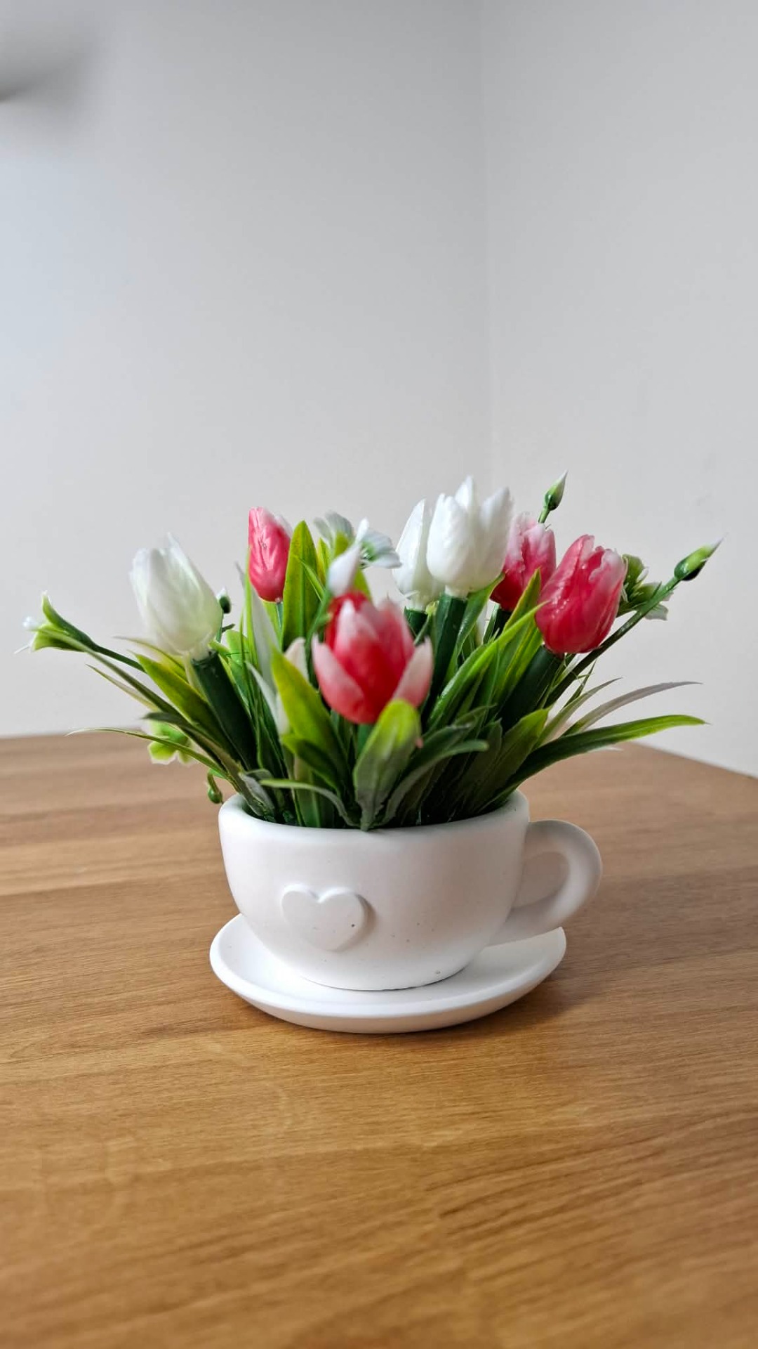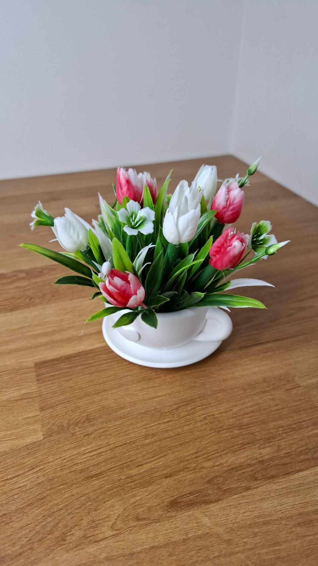 Jemná bílo-růžova kombinace v ručně odlévaném hrníčku je krásnou dekorací na stůl, komodu, okno.