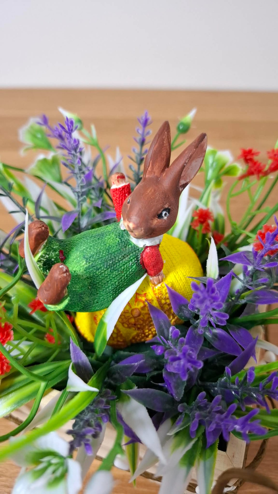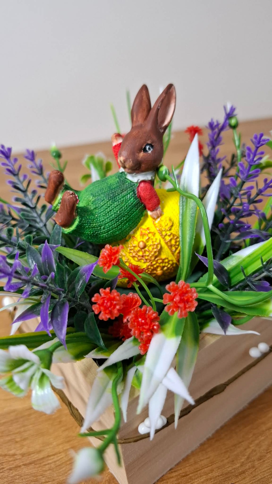 Dekorace je ideální jako velikonoční výzdoba, milý dárek nebo drobný sezónní detail do bytu. Díky kompaktním rozměrům se hodí na poličku, komodu i svátečně prostřený stůl.