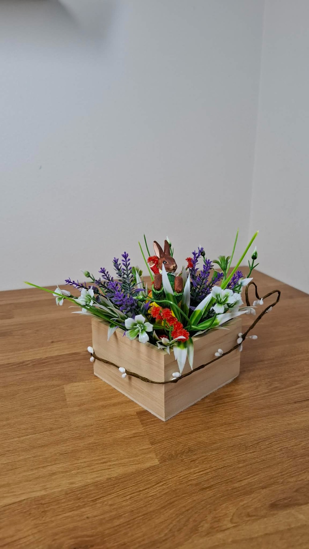 Jemná jarní kompozice, která vnese do interiéru svěžest a hravost. Dřevěná krabička ukrývá rozkvetlou louku plnou barev – bílé květy, levandulové klasy i drobné červené akcenty doplňují roztomilého zajíčka v zeleném kabátku. Celek působí něžně, ale zároveň výrazně díky bohaté kombinaci květin a zeleně.