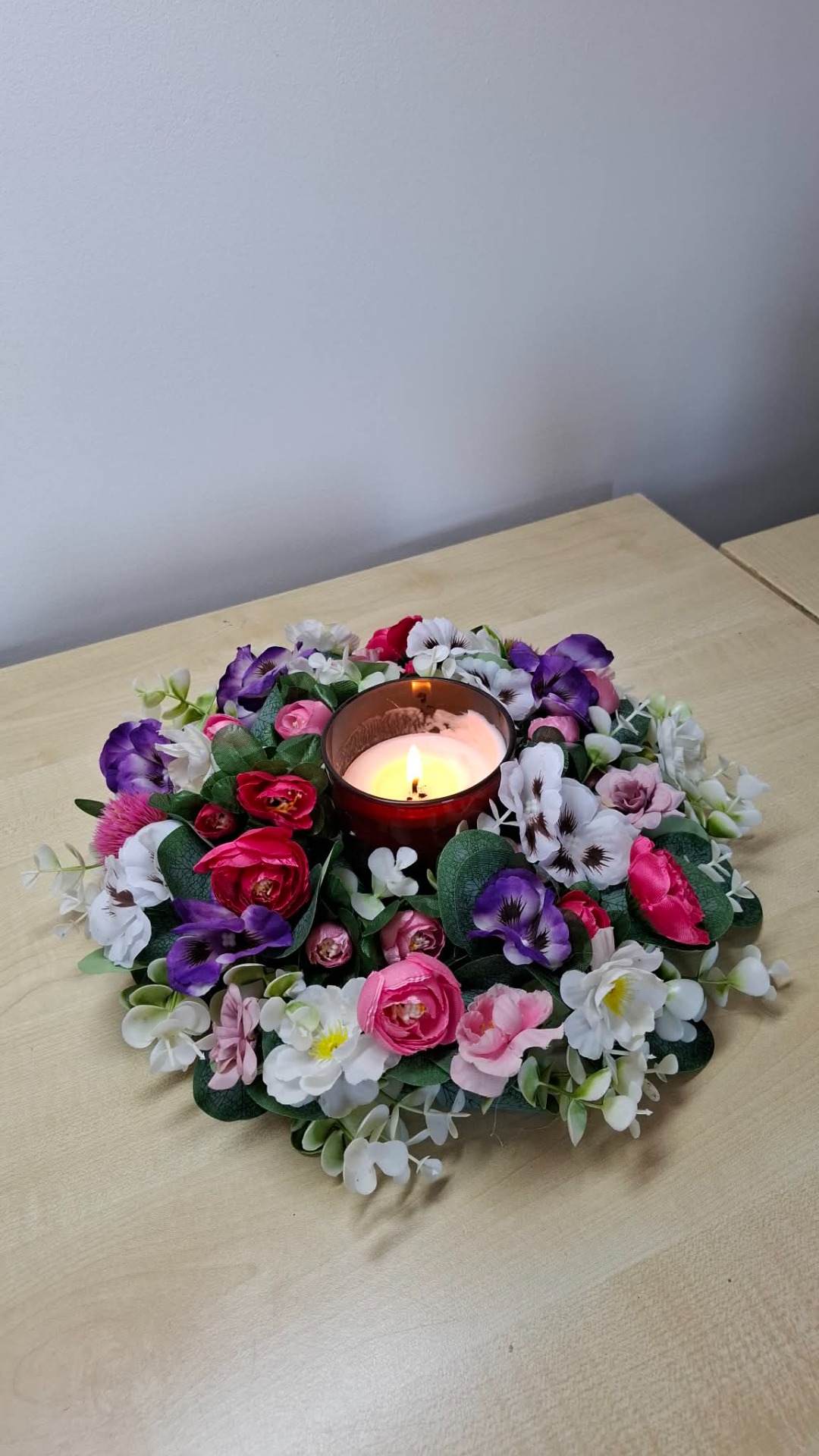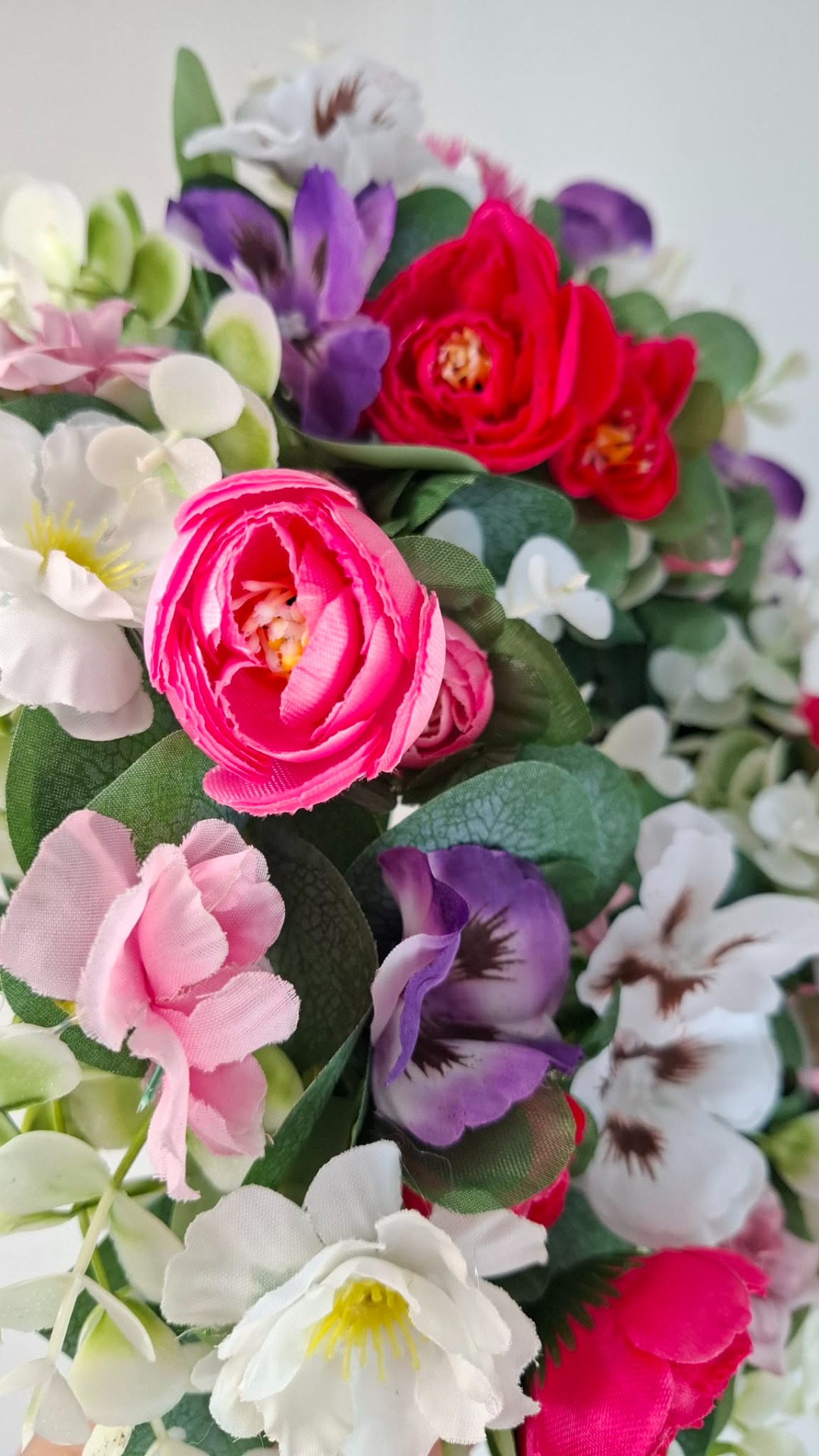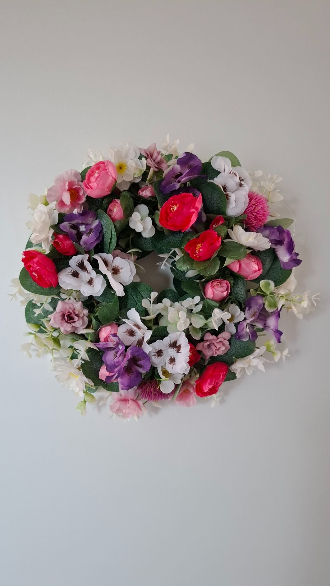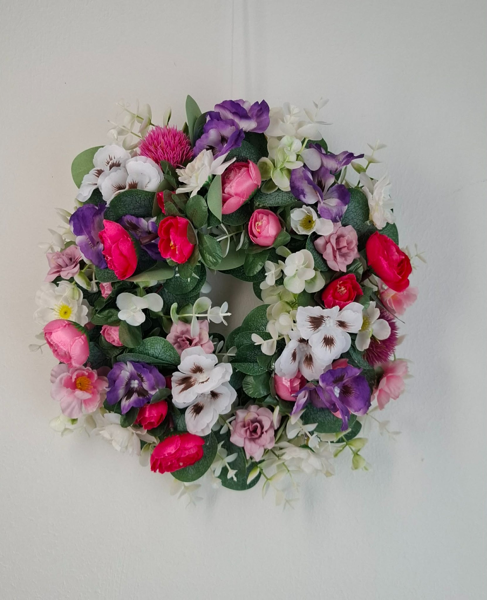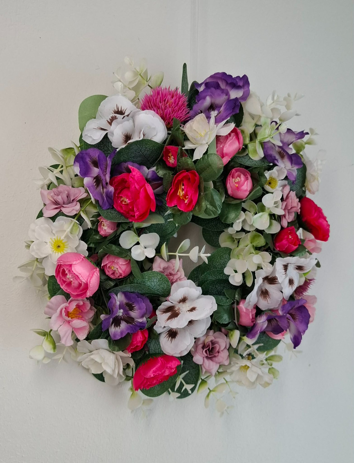Bohatý, romanticky laděný věnec plný květů, který rozzáří každý interiér. Kombinace sytě růžových a jemně pudrových tónů doplněná fialovými a bílými květy vytváří svěží, ale zároveň elegantní celek. Hustý základ z listů dodává dekoraci plnost a přirozený vzhled.