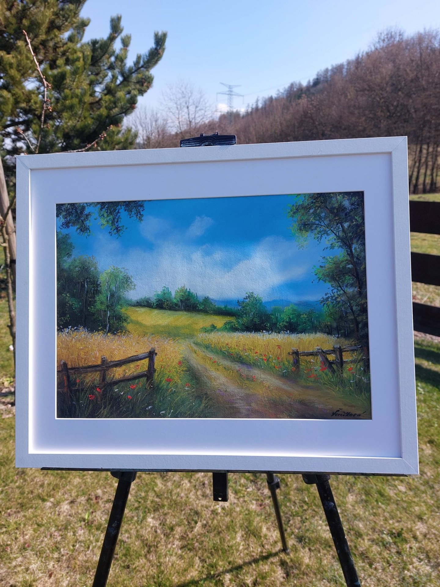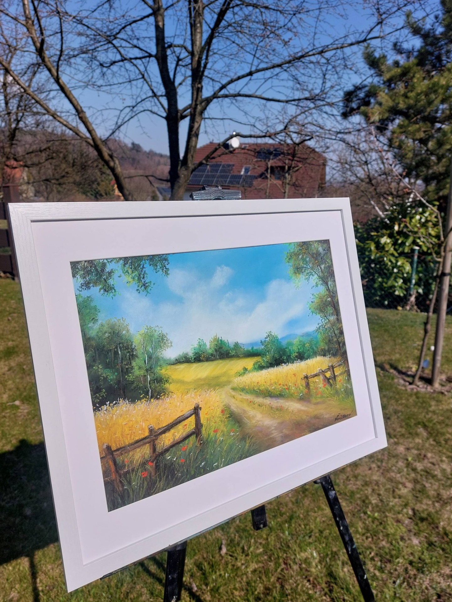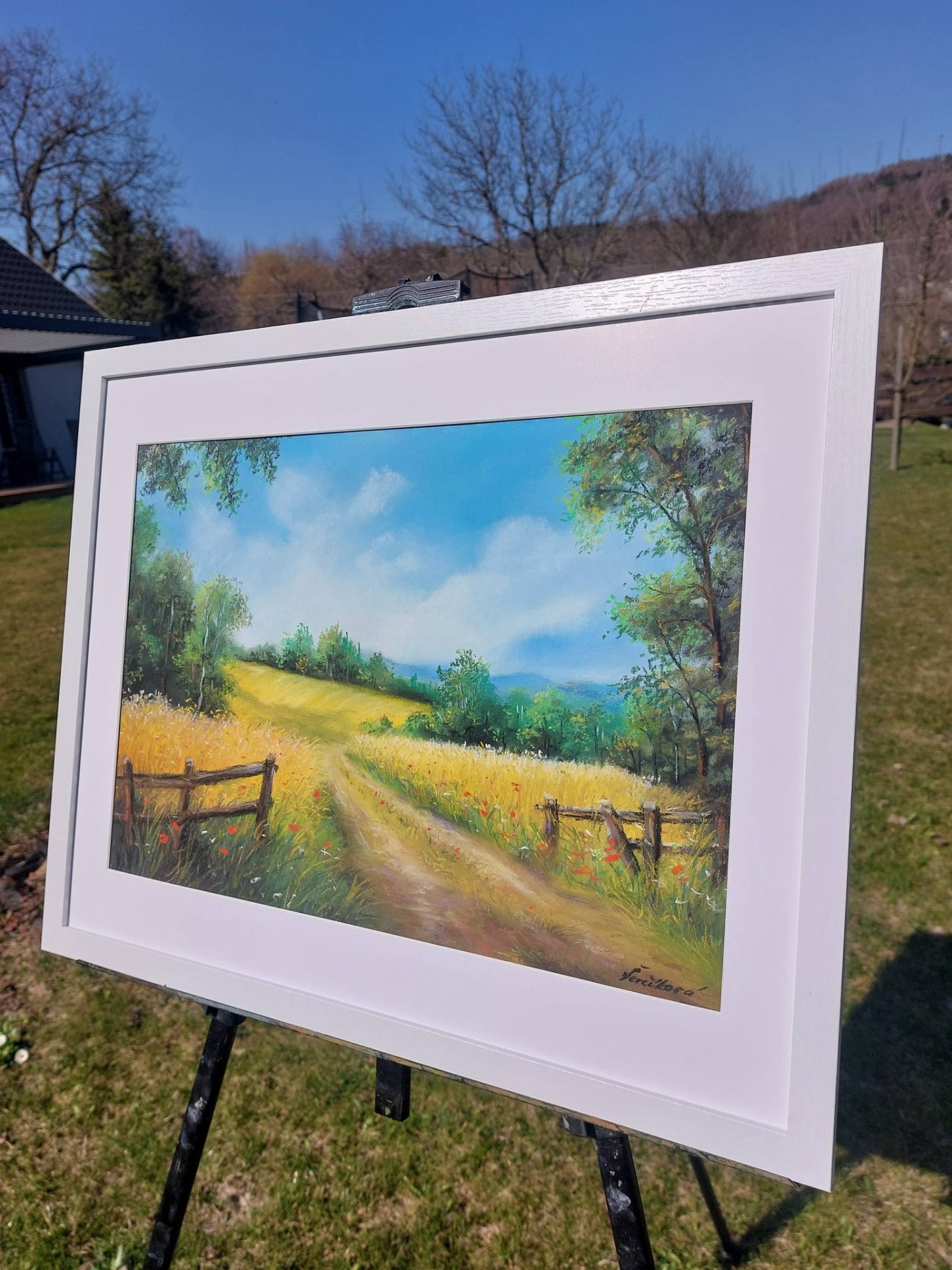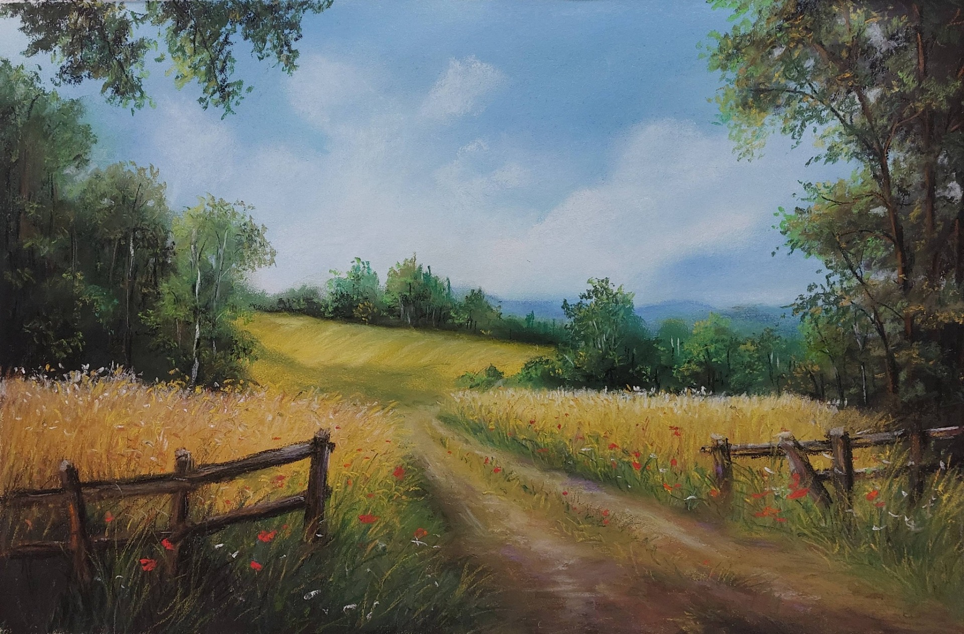 Klidná letní krajina, kde se cesta ztrácí mezi zlatými klasy a vede k tichu a pohodě